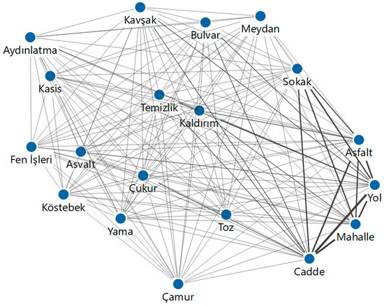 While identifying keywords, the method described in the study by [30] was taken into consideration. Since Turkish is an agglutinative language, word roots were identified, and their frequencies were combined. Service quality dimensions were established by mapping the relationships between the words, as shown in Figure 8, and providing co-occurrence matrix, as seen in Table 6. Due to the collected data being in Turkish, the keywords in the code maps appear in Turkish. Their English equivalents are given in Table 7. This section only presents the street–road–high street maintenance and repair service. Text mining processes for other service quality dimensions are provided in Appendix A.