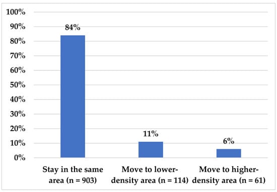 Most (84%) respondents expected that they would continue to stay in a similar area to where they currently lived. Around twice as many anticipated moving to lower-density (11%) compared to higher-density areas (6%) (see Figure 2). Respondents who reported intending to move to a lower-density area most frequently indicated it was to have more space (38%), followed by ease of travelling further (27%), being able to relax during travel time (25%), and being productive during travel (11%). Those anticipating moving to higher-density areas most often indicated it was because it is easier to travel in urban areas (44%), followed by easier to travel further (31%), more footpaths (30%), nicer to live in urban areas (25%), more cycleways (20%), can be productive during travel (16%), and can relax during travel time (8%) (see Table 2). Virtually no respondents selected the ‘other’ open-ended response option.