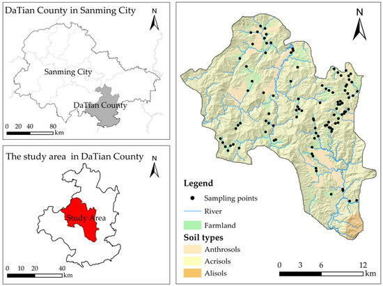Sanming City, Datian County, is one of the main mining areas in Fujian Province and is also one of China’s top 100 key coal-producing counties. This county is designated in Fujian Province as a primary raw material base for the Sanming Iron and Steel Plant, having abundant mineral resources and earning the title of a Treasure Trove in Central Fujian. The study area (117°38′–117°53′ E, 25°38′–25°56′ N) is located in the central region of Datian County, Sanming City, Fujian Province, with an area of 406 km2. The area has a subtropical monsoon climate and is located in Central Asia. The annual average temperature ranges from 15.3 to 19.6 °C, and the annual precipitation ranges from 1491 to 1809 mm [27]. The overall topography of the study area is undulating, with higher elevations in the western and central regions. The soil types in the study area are classified according to the World Reference Base for Soil Resources (WRB) international soil classification system, primarily as Acrisols and Anthrosols, followed by Alisols. Most mountain soils are residual parent material, while ridge fields and terraced fields mainly consist of slope deposition parent material. Fields along riversides and coastal areas are composed of slope deposition and alluvial parent material. Most of the lead–zinc mining and smelting areas are located in the central part of the study area. In the southern part of the study area, tributaries flow from north to south into the Junxi River, while in the northwestern part, Zhangdi Creek, Dongpu Creek, and Tangquan Creek flow from south to north. The main economic crops in the study area include rice, corn, and wheat. Additionally, livestock farming is widespread, primarily involving the breeding of pigs, rabbits, sheep, and poultry.