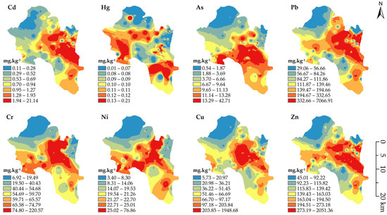Spatial distribution of the soil heavy metal contents in the study area.