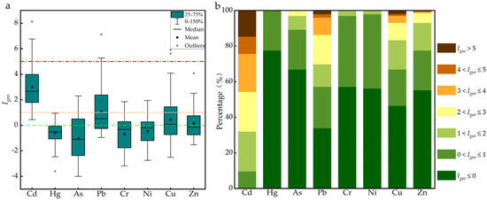 Results of the geoaccumulation index. (a) Box plot of the geoaccumulation index, the green, orange, and red lines represent the boundaries for 0, 1, and 5, respectively.; (b) proportion of heavy metals classified.