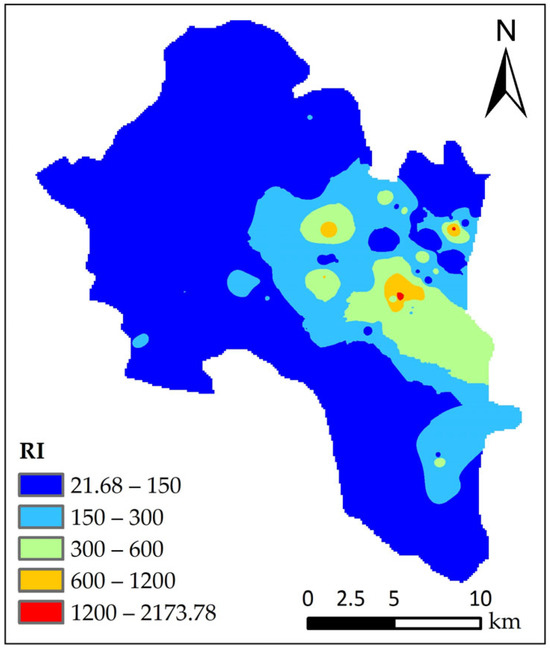 The ecological risk assessment of heavy metals is crucial for soil planning and risk control [33]. The RI method [31] not only considers the content of heavy metals in samples but also considers the biological toxicity of heavy metals. This method reflects the potential impact of various heavy metal pollutants on the ecological environment and is widely used in studies on heavy metal risk assessment [34].