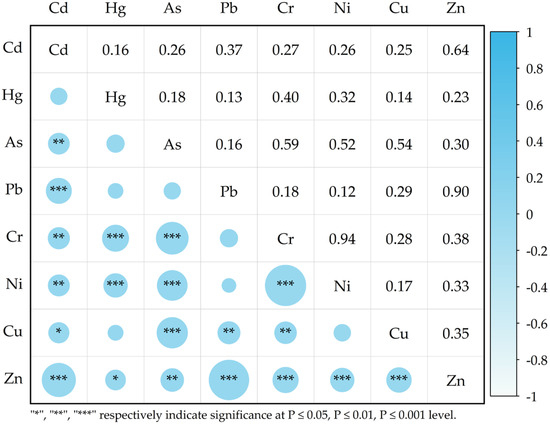 Correlation analysis is a common method for identifying potential sources of soil heavy metal pollution in a region [41]. Correlation analysis can initially infer whether the sources of heavy metals are the same, laying the foundation for subsequent pollution source resolution [42]. If there is a significant correlation between multiple elements, they may have the same or similar sources. Correlation analysis of heavy metals in the study area, as shown in Figure 5, revealed a significant positive correlation between Pb and Zn (p < 0.001), with a correlation coefficient of 0.897, indicating the possible co-origin of Pb and Zn heavy metals. The correlation coefficients between As, Cr, and Ni were all greater than 0.5, indicating a significant positive correlation (p < 0.001) and suggesting that these three heavy metals may share the same or similar sources. Cd and Pb each showed weaker correlations with elements other than Zn but exhibited a significant positive correlation with Zn (p < 0.001), indicating that the sources of Cd and Pb differ from those of other elements excluding Zn or may involve antagonistic effects [43]. Additionally, Cu showed weaker correlations with elements other than As, indicating that the input of Cu in the study area is consistent with or co-originates with As. From the correlation analysis, it can be concluded that the sources of heavy metals in the study area are complex, and accurate source determination cannot be achieved solely through correlation. Thus, a model for resolution should be established.