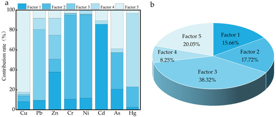 Source apportionment results from the PMF model. (a) Distribution of contribution rates of each factor in PMF to heavy metal contents in soil; (b) proportion of heavy metals contributed by each factor in PMF to the overall total.