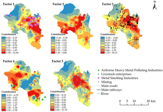 According to Figure 6b, Factor 1 contributed 15.66% of the total heavy metals. Cd had the highest concentration within Factor 1, accounting for 85.79%, followed by Zn and As, with contribution rates of 37.73% and 20.59%, respectively (Table 5), which is similar to the main contributing elements in the PCA results for PC4. The high contribution area of Factor 1 is located in the central-eastern and southeastern parts of the study area (Figure 7). It is observed from the figure that there was a high overlap with heavy-metal-related enterprises surveyed on-site, and most of these enterprises are involved in the emission of the heavy metal Cd, preliminarily indicating metallurgical enterprises as pollution sources. The accumulation of Cd is usually closely associated with industrial production and is a significant pollutant in industrial processes [51]. Datian County is home to numerous metallurgical enterprises, including dozens of large and small nonferrous metal ore processing enterprises in the study area. These enterprises discharge substantial amounts of wastewater, waste residue, and exhaust gases. Wastewater flows southwards through discharge outlets into the Junxi River, posing a significant pollution risk to surrounding farmlands and downstream of enterprises. Xing et al. [14] analyzed the surface soil near the lead smelting plant in Jiyuan City and found a significant correlation between the distance from the main lead smelting plant facility and the total Cd and total Pb concentrations. A study by Dragović et al. [13] on the spatial distribution of heavy metals in the soil around Serbia’s largest steel production plant showed that Cd, Pb, and Zn have higher hotspot distributions near the steel plant. Xiao et al. [52] reported that Cd and Zn usually coexist around sites of metal smelting and electroplating enterprises. Therefore, Factor 1 is inferred to be a pollution source from metal smelting enterprises.
