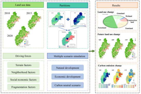 The workflow of this study is shown in Figure 1. Integrating land use data, partitioned results, a series of driving factors, and three scenarios, we explored the impact of developing a strategy on land use change and carbon emissions at the city and county scales.