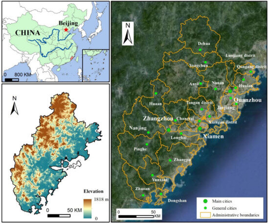 The XZQ (116°53′–119°05′ E, 23°23′–25°56′ N) is located on the southeast coast of China (Figure 2). It has a subtropical marine monsoon climate, whose terrain generally declines from the northwest to the southeast. The landform is diverse, including mountains and plains scattered throughout. The XZQ has 12 municipal districts, 4 county-level cities, and 13 counties. In 2021, the permanent resident population reached 19.2 million, and the GDP was approximately CNY 2.3 trillion. The XZQ is an economically developed area in Fujian Province, with a GDP accounting for 50% of the entire province. Xiamen is dominated by the tertiary industry, which accounts for approximately 60% of the GDP. Zhangzhou and Quanzhou are dominated by the secondary industry, which accounts for nearly 50% of the GDP for two cities. Overall, this region is complementary, intensive, and synergistic.