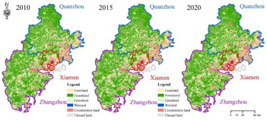 Great progress has been made in the construction of ecological civilization in XZQ. Meanwhile, a large amount of farmland has been converted into construction land during rapid urbanization [44,45]. Additionally, the carbon emissions of this region are at a relatively high level. The Chinese government has announced an outline of the “carbon peak and carbon neutralization” strategy for XZQ [46]. Thus, high-quality economic development in the XZQ is necessary. Many favorable policies and plans have been released to advance “The Belt and Road Initiative” and the “Xiamen Free Trade Zone”. The XZQ metropolitan circle will encounter challenges regarding economic development and carbon neutralization. Therefore, exploring the effect of the land use dynamic on carbon neutralization is meaningful for regional sustainable development and urban planning.