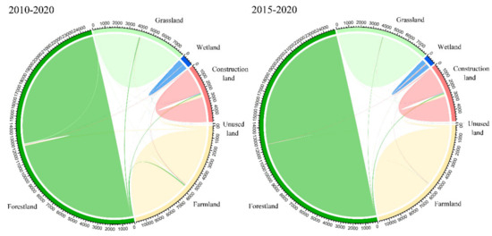 Forestland and farmland covered 50.3% (12,454.9 km2) and 22.2% (5509.2 km2) of the entire region in 2010, respectively (Figure 3 and Figure 4; Table 4). However, farmland experienced a decrease by 3.9% (215.4 km2 net loss), whereas the forestland changed little by 2020. The grassland and wetland decreased by 14.8 km2 and 2.1 km2 from 2010 to 2020. The construction land substantially expanded, with an increase of 41.0 km2 during 2010–2015 and 257.2 km2 during 2015–2020. According to the analysis above, urban expansion mainly occupied farmland.