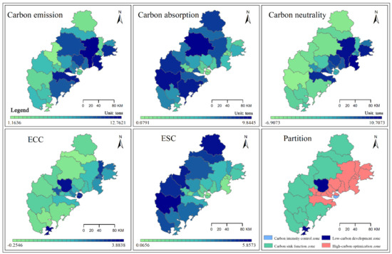 The carbon emission presented a high level in the northeast and southeast, especially for the area surrounding Quanzhou and Zhangzhou (Figure 5). This suggested that the land in the northeast and southeast was relatively disturbed by human activities. The carbon emission level in Xiamen was lower than that in Quanzhou and Zhangzhou, which was caused by the difference in the industrial structure between these two types of cities. The carbon absorption in the western regions was higher than that in the coastal areas. In terms of carbon neutrality, the area surrounding the main city acted as a carbon source, whereas the western regions played a key role in the carbon sink. As for the ECC, the pattern was similar to that of the carbon emissions. The pattern of the ESC corresponded to the carbon absorption. The main types were the carbon sink function zone and the high-carbon optimization zone. The carbon sink function zone was concentrated in the western region, whereas the high-carbon optimization zone was concentrated in Xiamen, Zhangzhou, and Quanzhou. Only two counties belonged to the low-carbon development zone, and one county belonged to the carbon intensity control zone.