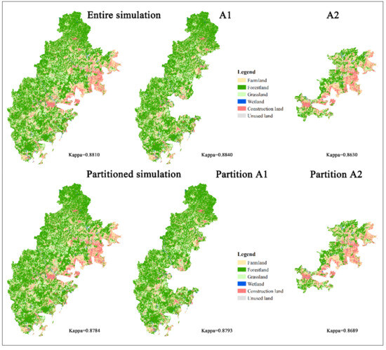 Based on the partitioned results, we merged the low-carbon development zone into the carbon sink function zone (Partition A1) and merged the carbon intensity control zone into the high-carbon optimization zone (Partition A2) for the simulation. The future land use in 2030 was simulated based on the entire region and the partitioned areas, respectively. Two aspects of comparison were carried out, as follows: the partition simulation results of the XZQ metropolitan circle were compared with the corresponding results extracted from non-partition simulation; the partitioned simulation results were fused and inlaid and were then compared with the non-partitioned simulation results of the XZQ. The difference in Kappa coefficients of the entire simulation result and the partitioned simulation result was not obvious (Figure 6). The partitioned PLUS model performed better than the entire PLUS model in the developed areas, but performed worse in undeveloped areas.