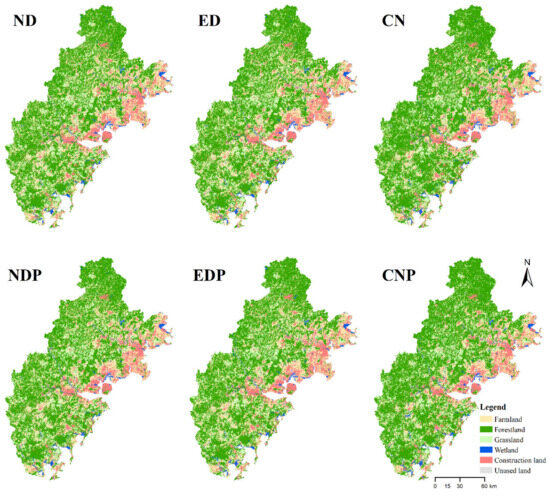 In the ND, the areas of farmland, forestland, grassland, wetland, and construction land were 5153.7 km2, 12,371.3 km2, 3909.9 km2, 473.7 km2, and 2847.7 km2, respectively (Figure 7; Table 5). Compared to the situation in 2020, the construction land increased by 215.5 km2, the farmland displayed a significant decrease by 138.1 km2, followed by the forestland, grassland, and wetland, with decreases of 44.8 km2, 19.7 km2, and 12.8 km2, respectively. This suggests that maintaining the current level of economic development would lead to the continuous rapid expansion of construction land, along with the substantial loss of farmland. In the ED, the construction land increased by 261.0 km2, and the farmland decreased by 224.2 km2, compared to the situation in 2020. The total natural land (forestland, grassland, and wetland) decreased by 36.7 km2. This suggests that farmland would have a high loss with urbanization, and the natural land would be somewhat protected. In the CN, the main land use change was the conversion of farmland into forestland. The loss of farmland was 1322.3 km2, and the increase in forestland was 1226.0 km2. Meanwhile, the construction land increased by 129.5 km2, whose growth rate (4.9%) was lower than that for the ND (8.2%) and ED (9.9%). The amount of the land use change area in the partitioned simulations was similar to that in the nonpartitioned simulations, but the land use change acquired from these two simulation types presented different spatial distributions. For example, the increased construction land was mainly distributed in Huian, Jinjiang, and Nanan in the ED with nonpartitioned simulation; however, it was concentrated in Longhai and Nanan in the ED with the partitioned simulation.