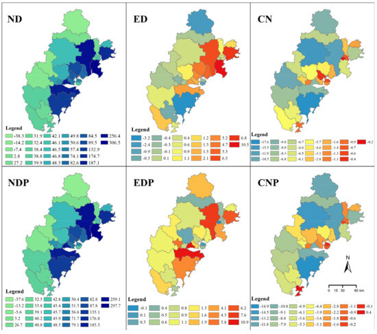 At the county scale, the carbon emissions tended to significantly decrease in Dehua and Zhangpu, but significantly increase in Huian, Jinjiang, and Nanan in the ED scenario, compared to the situation in the ND scenario (Figure 8). The land use carbon emissions in the CN scenario were lower than those in the EDP. In terms of the partitioned simulation, the land use carbon emissions in the EDP exhibited an increasing trend compared to that in the NDP. Longhai and Nanan experienced the highest increase in land use carbon emissions with amounts of 10.9 × 104 tons and 7.6 × 104 tons, respectively. The pattern of carbon emission change was similar to that in the CN scenario.