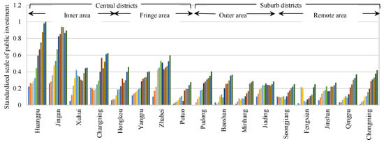 Table 1 reports the descriptive statistics of the samples. The results indicate that BR and LTF are at a relatively low level in most of the studied districts (0.11 and 0.077). The significant disparity between the maximum and minimum value of BR and LTF suggests their obvious variability. The disparity between the maximum and minimum values of GPD growth rate, average wage, housing price, public transit, and night light intensity also suggests significant variations in socio-economic condition and built environment across districts. Figure 3 reports the amount of the public service investment by the district from 2005 to 2016. It is obvious that public service investment in the central districts including the inner area and fringe area is much higher than the suburb districts, including suburb areas and remote areas.