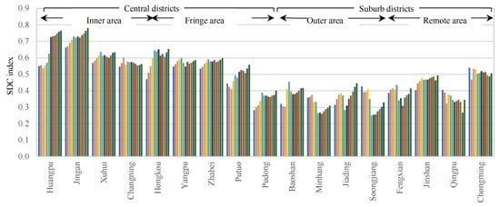 According to the evaluation results of the SDC index (Figure 4), all districts are below the level of 0.8. There are only two districts of Jingan and Huangpu in the inner area attaining the range of 0.7–0.8. The SDC index in districts of inner area and fringe area is comparatively higher than other districts in suburb and remote areas. The average growth rates of the SDC index are higher in inner (18%) and fringe areas (21than in outer areas (16%) and remote areas (2%).