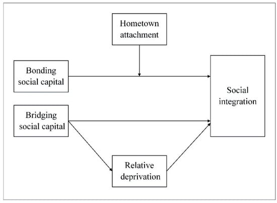 In the context of urbanization in China, hometown attachment reflects the nostalgia of rural-to-urban migrants for their hometown’s way of life, customs, and moral beliefs. Although early studies indicated a negative correlation between hometown attachment and mobility [43], later research found that geographical mobility does not weaken migrants’ attachment to their homeland; they maintain deep connections with their place of origin [44]. In fact, migrants with more bonding social capital fit this characteristic, maintaining close ties with their home and through kinship and locality, reflecting their satisfaction and identification with their homeland. Moreover, connection and attachment to a place can increase the willingness to stay there, and may even lead to a tendency to return [45]. Moreover, during the migration process from rural to urban areas in China, due to the restrictions of the household registration system, many migrants are unable to access public services and welfare based on their household registration, which puts them in an unstable situation in the city and potentially increases the likelihood of their returning to their place of origin. In light of these issues, we pose the following research question: “Does hometown attachment positively moderate the negative impact of bonding social capital on social integration?”.