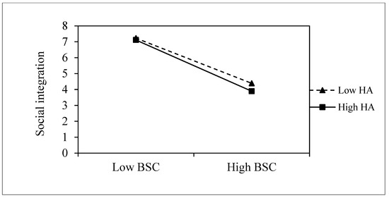 To test the moderating effect of hometown attachment, we constructed an interaction term between bonding social capital and hometown attachment. The results in Table 4 show that the path coefficient of the interaction term is significantly negative (β = −0.011, p < 0.001), indicating that the moderating effect of hometown attachment is established. To visually illustrate the moderating effect of hometown attachment, we plotted a simple slopes graph, as shown in Figure 2. From the graph, it can be observed that, as bonding social capital increases, social integration tends to decrease. Moreover, the slope under the condition of high hometown attachment is noticeably steeper than under the condition of low hometown attachment, suggesting that, as hometown attachment deepens, the negative impact of bonding social capital on social integration is strengthened.