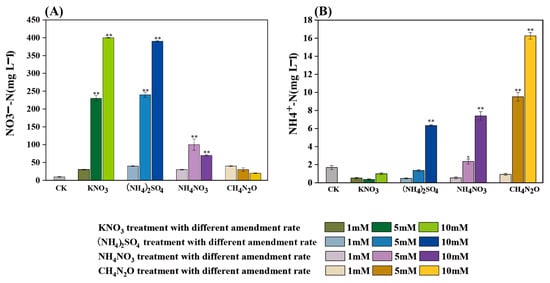The contents of NO3−-N (A) and NH4+-N (B) in soil porewater with different treatments. Notes: Data are expressed as mean ± SD (n = 3). The invisible error bar means that the standard deviation of the mean is small and close to zero. The asterisk indicates the significance of the difference between the control soil and different N treatments (LSD’s test at α = 0.05, *, p < 0.05; **, p < 0.01).