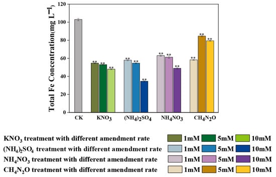 The contents of dissolved Fe in porewater. Notes: Data are expressed as mean ± SD (n = 3). The invisible error bar means that the standard deviation close to zero. The asterisks indicate the significance of the difference between the control soil and different N treatments (LSD’s test at α = 0.05, **, p < 0.01).