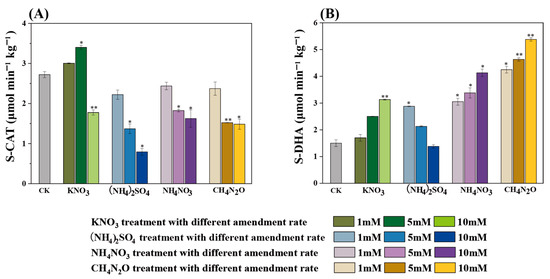 The activities (μmol min−1 kg−1) of soil catalase (S-CAT) (A) and dehydrogenase (S-DEH) (B) under different treatments. Notes: Data are expressed as mean ± SD (n = 3). The invisible error bar means that the standard deviation of the mean is small and close to zero. The asterisks indicate the significance of the difference between the control soil and different N treatments (LSD’s test at α = 0.05, *, p < 0.05, **, p < 0.01).