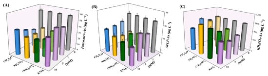 The concentrations of As in the porewater with KNO3, (NH4)2SO4, NH4NO3, and CH4N2O were 13.7–26.7%, 40.4–52.0%, 38.7–44.8%, and 30.5–50.5% lower than in the control, respectively (Figure 4A and Figure S1A). All N applications, regardless of the applications rate, significantly decreased the dissolved As (p < 0.05). However, the application rate had no significant effect on the same N species, which was probably because the different nitrogen fertilizers contain different ions and have different effects on arsenic. The dissolution of As is one of the important indicators for available-As assessments. The soil pH and enzymatic activity may be the main factors as a result of the correlation analysis, demonstrating that the dissolved As was significantly positive/negative relative to the pH, S-CAT, and S-DEH activity (Table 3).
