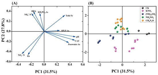 For the different N treatments, PCA plots were used to visualize the key chemical parameters associated with pH, ORP, NO3−-N, NH4+-N, S-CAT, S-DEH, dissolved Fe, water-soluble As, SPLP extractable As, and KH2PO4 extractable As (Figure 5 and Table S1). Clear associations among pH, S-CAT, and water-soluble As were found via the principal components analysis (PCA) of all N treatments. Similarly, KH2PO4 extractable As, NH4+-N, and S-DEH also presented clear associations. The PCA also highlights a clear differentiation in water-soluble As and KH2PO4 extractable As between the different N species. These parameters in the soil with KNO3 applications were different from other N treatments (Figure 5B). The correlations between all parameters (Table 3) also highlight the important contribution of N fertilization on redox-sensitive changes in the soil, including the redox potential, oxidoreductase activity, and reductive dissolution of Fe, thus affecting the mobilization of As. The effects of the different parameters varied for both soluble As or extractable As.