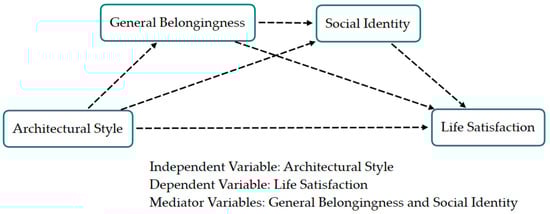 The sustainable combination of modern minimalist architecture and traditional regional architecture is recognized in both academic and practical fields of urban planning [7,8,15], but there are gaps in the existing research. Traditional regional architecture typically focuses on preservation, while modern minimalist architecture aligns with the fast-paced rhythm of modern development [16,17]. However, in the context of increasingly stabilized urban development, comparative discussions on the impact of these architectural styles on residents’ life satisfaction are relatively scarce. Furthermore, the psychological aspects of general belongingness and social identity have not been collectively discussed in this relationship. In other words, previous studies analyzing the path from architecture to life satisfaction have overlooked the chained mediation effects of general belongingness and social identity.