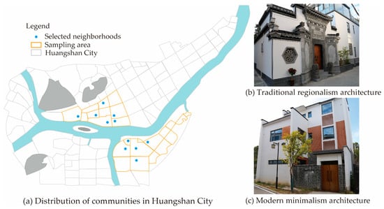 In Figure 2a, we have illustrated an outline map of the urban planning for Huangshan City, depicted with grey lines. This area represents the main residential zone for the residents of Tunxi District and serves as the urban core of Huangshan City. The regions highlighted with yellow lines indicate our sampling areas, which are characterized by a rich presence of both traditional regionalist architecture and modern minimalist architecture. Within these highlighted areas, we have used blue dots to mark the coordinates of the residential neighborhoods that were selected through random sampling. These selected neighborhoods encompass a diverse range of architectural styles, allowing for a comprehensive analysis of the impact of architectural design on residents’ life satisfaction.