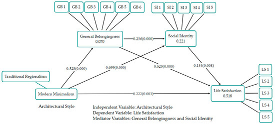 The arrows in the diagram represent the hypothesized relationships between variables, with path coefficients and significance levels provided in parentheses. For example, the path from modern minimalist architecture to general belongingness has a coefficient of 0.528 with a significance level of 0.000, indicating a strong and statistically significant positive relationship. Similarly, the path from general belongingness to life satisfaction has a coefficient of 0.236 (0.000), showing a significant positive impact. The model also illustrates the mediation effects, where general belongingness and social identity mediate the impact of architectural style on life satisfaction. The combined indirect effects (e.g., from modern minimalist architecture to life satisfaction through general belongingness and social identity) highlight the pathways through which architectural styles impact residents’ life satisfaction.