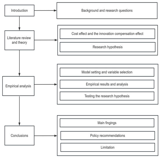 The traditional neoclassical school of environmental economics generally believes that the costs are such that environmental regulation creates a heavy economic burden on the regulated firms and this could affect total output and have a negative impact on the economic growth [,]. The focus of attention in this research is the cost of environmental regulation, including (1) the direct costs associated with pollution abatement; and (2) the opportunity costs associated with firms reducing investment in other innovative projects in order to increase investment in pollution abatement. In particular, as a result of the government’s environmental regulation policy being put into effect, the enterprise’s operating costs will rise in order to comply with environmental protection standards in their production and operation processes. This compliance can be achieved by increasing investment in pollution control measures, reducing the intensity of pollutant emissions, or paying pollution charges. This will result in higher operational expenses for the business, i.e., the environmental regulation of the production activities of the enterprise will have a “cost effect” []. The increase in production costs will cause enterprises to reallocate resources and will lead to the shift of labor and capital from productive activities to environmental protection and pollution control. This will, to some degree, impede business output and technical advancement. It also does not help businesses become more productive, which impedes economic development.