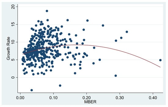 For MBER, Hypothesis 2 is proven. The scatter plot and fitting curve of MBER and economic growth are presented (Figure 2). The scatter distribution of each variable reveals the following: The majority of the sample points for MBER are clustered to the left of the symmetry axis. This pattern indicates that, despite the regression results suggesting an inverted U-shaped relationship, market-based environmental regulation policies continue to exert a positive impact on overall economic growth. Consequently, the non-linear analysis supports the baseline regression findings, affirming the robustness of the model.