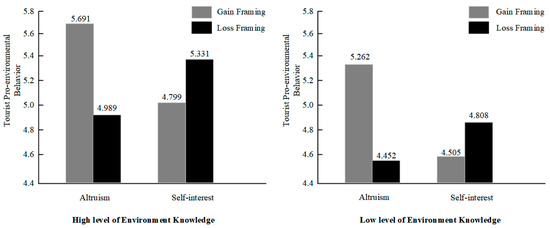 Moderation effect analysis. A three-way analysis of variance (ANOVA) was conducted with goal framing, benefit appeals, and environmental knowledge as independent variables, demographic characteristics as control variables, and tourist pro-environmental behavior as the dependent variable. The results revealed a significant interactive effect of the three factors on TPEB (F(1, 359) = 24.333, p < 0.001), confirming hypothesis H3, indicating that environmental knowledge moderates the relationship between goal framing and benefit appeals’ effects on TPEB. Further simple effects analysis revealed that under high levels of environmental knowledge, tourists’ pro-environmental behavior induced by different types of goal framing and benefit appeals was higher compared with those under low levels of environmental knowledge (Figure 5). Additionally, regardless of the level of environmental knowledge, altruistic appeals paired with gain framing and self-interested appeals paired with loss framing both exhibited matching effects on tourists’ pro-environmental behavior, further validating hypotheses H1a and H1b.