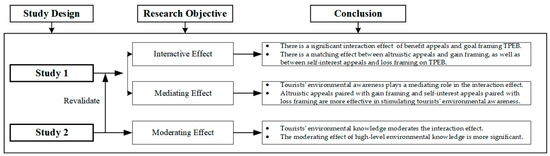 The drive to foster tourists’ pro-environmental behavior (TPEB) is a current research hotspot amidst the deteriorating ecological environment. However, existing studies have yet to reach definitive conclusions on how tourist destinations influence TPEB through different benefit appeals and goal framing. This paper investigates the interactive effects of these factors on TPEB, reporting on two experiments. Study 1 confirmed significant interactive effects of benefit appeals and goal framing on TPEB, wherein altruistic appeals and gain framing, as well as appeals to self-interest and loss framing, demonstrates matching effects. Furthermore, environmental awareness mediated these interactions. Study 2 established that tourists’ environmental knowledge moderates the interactive effects of goal framing and benefit appeals on TPEB. The moderating effect of high-level environmental knowledge is more pronounced, and tourists with higher environmental knowledge are more inclined to engage in TPEB compared with those with lower levels of environmental knowledge. The conclusions of this study not only enrich the research on influencing factors and mechanisms of TPEB but also offer practical insights for environmental management in tourist destinations.
