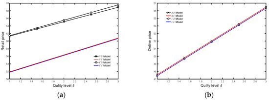 In terms of quality requirements, Hosseini-Motlagh et al. [25] found that product quality was closely related to the length of the warranty period. Li and Chen [26] studied the supply chain of two manufacturers supplying products of different quality to one retailer. Chakraborty et al. [27] showed that two manufacturers can increase profits by improving the difference between the two products in terms of quality (low-quality competition). However, they all compete for sales only through an offline channel. Ranjan and Jha [28] explored the pricing strategy among members of a dual-channel supply chain. Sarkar and Bhadouriya [29] discussed the manufacturer’s choice of green quality and the retailer’s price decision when the product’s green level exceeds a threshold. Lin et al. [30] found that under certain conditions, reducing product quality and wholesale price was beneficial to both manufacturers and retailers.