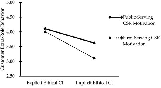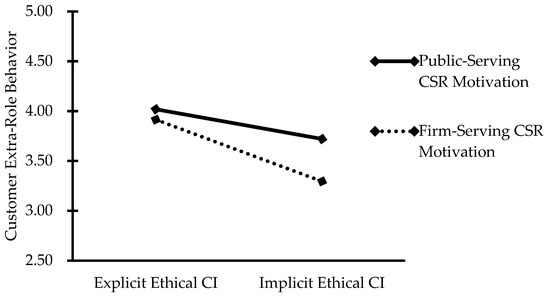 Moreover, the examination revealed a noteworthy interaction between the motivation for CSR and the ethical identity of the corporation in predicting customer behavior that goes beyond their expected roles (F = 4.18, p = 0.042 < 0.05) (see Table A23 and Table A24 in Appendix B). The data presented in Figure 4 indicate that extra-role behavior is significantly higher under the condition of public-serving motivation and explicit ethical corporate identity (MEXPSM = 4.02). Conversely, extra-role behavior is lower under the condition of firm-serving motivation and implicit ethical corporate identity (MIMFSM = 3.30). In the scenario where CSR was not aligned with organizational values, a significant discrepancy was observed in the extent of extra-role behavior. The strength of the link between motivation for CSR and engagement in extra-role behavior was found to be enhanced by the moderating effect of ethical corporate identity. Customers demonstrate a higher inclination to engage in behaviors beyond their actual requirements for companies that have established ethical corporate identities, particularly when these identities are explicitly communicated before CSR initiatives. This trend is observed in both public-serving conditions (MEXPSM = 4.02 > MIMPSM = 3.72) and firm-serving conditions (MEXFSM = 3.91 > MIMFSM = 3.30). Therefore, the second hypothesis (H2) is supported.