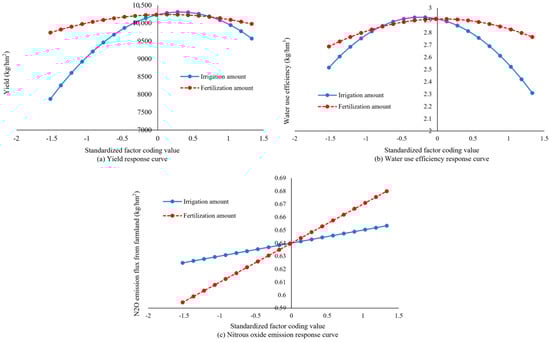 The results of the significance analysis for Equations (8)–(10) are P1 = 0.0001, P2 = 0.0001, and P3 = 0.0005, indicating that all regression relationships reach an extremely significant level. Equations (8)–(10) have R2 values of 0.9480, 0.9198, and 0.9775, respectively, indicating a good fit between the regression simulation and actual values. This suggests that simulated values can effectively represent actual ones, and this model can be used to predict the summer maize yield, water-use efficiency, and simulated field N2O emissions. From the first-order coefficients in Equation (8), it is evident that the impact of the irrigation volume on the summer maize yield is greater than that of the fertilization amount. Within a certain range, both the irrigation volume and fertilization amount have a positive effect on the summer maize yield. From the first-order coefficients in Equation (9), it is evident that the impact of the irrigation volume on the summer maize water-use efficiency is greater than that of the fertilization amount. The fertilization amount has a positive effect on the summer maize water-use efficiency, while the irrigation volume has a negative effect. From the first-order coefficients in Equation (10), it is evident that the impact of the fertilization amount on the field N2O emission flux is greater than that of the irrigation volume. Additionally, both the irrigation volume and fertilization amount have a positive effect on the field N2O emission flux.