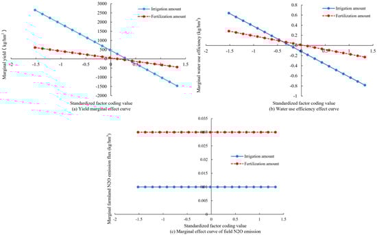 In these equations, dy1x1/dx1 and dy1x2/dx2 represent the marginal effect functions of irrigation and fertilization on the yield, dy2x1/dx1 and dy1x2/dx2 represent the marginal effect functions of irrigation and fertilization on the water-use efficiency, and dy3x1/dx1 and dy3x2/dx2 represent the marginal effect functions of irrigation and fertilization on the farmland N2O emission flux. The single-factor marginal effect curves are shown in Figure 3.