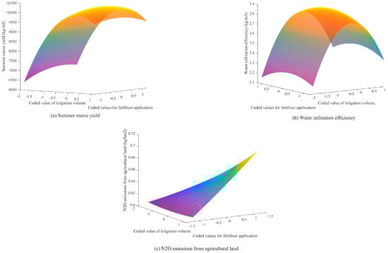 Based on the coding values of the irrigation volume and the coding values of the fertilization amount from the data in Table 1, binary quadratic regression models were utilized to establish regression models for the summer maize yield, water-use efficiency, and field N2O emission flux.