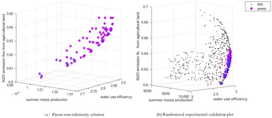 MATLAB was used to design the program for the fast non-dominated sorting genetic algorithm NSGA-III. The decision variables are the irrigation amount and fertilization amount, and the genetic encoding adopts real number encoding, with each chromosome divided into two parts for the irrigation amount and fertilization amount. Using the NSGA-III algorithm to solve the above three-objective optimization model, setting the population size as P = 100, crossover probability as Pc = 0.8, mutation probability as Pm = 0.02, and the number of evolution generations as T = 500, we obtained the Pareto non-dominated solutions, as shown in Figure 5a. Finally, 500 random experiments were conducted to verify that the Pareto non-dominated solutions are within the specified solution range, indicating the reasonableness of the Pareto non-dominated solutions, as shown in Figure 5b. At this point, the encoded values for irrigation and fertilization are 0.0644 and −0.7521, respectively, which correspond to actual values of 889.34 m3/hm2 and 158.59 kg/hm2. Ultimately, the maize yield was determined to be 10,129.00 kg/hm2, with a water-use efficiency of 2.85 kg/m3 and a field N2O emission flux of 0.61 kg/hm2. Comparing the optimized model with the high-fertilizer and high-irrigation experimental data, the results show an increase in the yield of 6.03%, an increase in the water-use efficiency of 6.17%, and a decrease in the field N2O emission flux of 13.77%. This optimization also leads to a water saving of 36.47% and a fertilizer saving of 26.58%. Comparing the optimized model with the moderate-fertilizer and moderate-irrigation experimental data, there is little difference in the maize yield and water-use efficiency. However, the field N2O emission flux increases by 3.12%. Additionally, there is a water saving of 15.30% and a fertilizer saving of 11.90%. Comparing the optimized model with the low-fertilizer and low-irrigation experimental data, the maize yield increases by 8.10%, water-use efficiency increases by 22.64%, and the field N2O emission flux increases by 0.89%. From this, it can be concluded that appropriate water and fertilizer management is beneficial for enhancing maize yields and water-use efficiency while simultaneously reducing the field N2O emission flux.