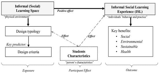 Beyond the significant benefits of informal and social learning spaces, the existing literature revealed various factors affecting the use of these spaces. Basically, the architecture and urban planning of the learning space play a critical role in their typology and how they are used [11]. The design aspects of learning spaces, including architecture and layout, greatly influence the identity of the space and the experience of its users [17,18]. For example, physical design aspects are critical to the student’s experience in utilising them [18]. Environmental elements and technological facilities in these settings are also essential for the students’ experiences [20,21]. Furthermore, students’ preferences and personal characteristics could also influence the use pattern of specific informal social learning spaces [21]. The proper design characteristics of these spaces contributed to acquiring awareness, social improvement, and learning in many areas. Overall, informal social learning settings and their design aspects provide critical sustainable learning settings on campuses for promoting resilient social learning experiences. Despite the wealth of research on learning settings, there remains a notable absence of a unified, precise definition and typology of informal learning settings within the existing literature. Therefore, there is a need for a systematic reference to define the typology of ILS, particularly in academic education.