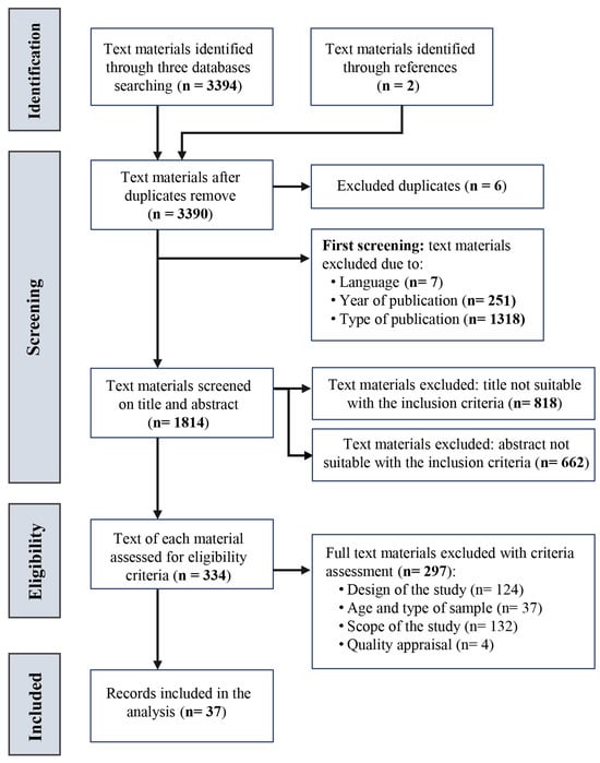 Firstly, a total of 3394 journal articles were identified through the search using the specified databases. Furthermore, two additional articles were included by manually searching the reference lists of the final selected full-text articles. After removing duplicate studies and including only peer-reviewed journal articles published in the English language from 2004 to 2024, a total of 1814 articles were retained. However, 1480 articles were rejected based on screening the title and abstracts, as they were considered ineligible due to the unsuitable scope of the studies (n = 1161) or the unsuitable sample of the study (n = 319). In the eligibility step, the two reviewers carefully reviewed a total of 334 full-text articles. Out of these, 37 full-text articles were included in the thematic and descriptive review, while 297 articles were excluded. The reasons for exclusion were as follows: 124 articles were review studies, 37 articles involved samples other than users of spaces in academic education who were not aged 18 years and above, 132 articles did not include any results on informal learning settings, and 4 studies did not meet the required quality standards (NOS total quality score less than 6). These rejected articles lacked data on outcomes, accurate exposure identification, proper control of confounding factors, or an adequate sample size. Figure 2 displays a PRISMA flowchart illustrating the selection process. The results were synthesised and analysed according to the three specified themes.