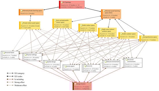 (b) The physical settings category was mentioned in 48.6% of the selected articles (n = 18) and referred to four aspects (codes), including location and proximity, availability, size and enclosure, and connectivity [10,11,12,13,26,27,34,35,40,41,42,47,50,54]. All of the ILS codes were strongly related to physical settings, including private indoor quiet spaces (all sub-codes: home bases, creative learning space, and library private room), semi-private semi-public indoor spaces (all sub-codes: active learning spaces and learning commons), public indoor spaces (all sub-codes: SLS, the Hub, the Edge, and Zone24), public semi-indoor/semi-outdoor space (three sub-codes: pocket settings, the Atrium, and other public semi-outdoors), outdoor spaces, and comprehensive spaces. This result showed that the physical setting design factor was significantly related to all six types of ILS in academic education.