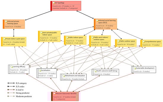 The current systematic review aimed to answer the main research questions: What are the typologies of informal learning spaces (ILS), and what are their significant design factors and relevant outcomes in sustainable academic education from architectural and urban planning perspectives? Therefore, it has made a notable contribution to the theoretical model of ILS by identifying six typologies of ILS, including (a) private indoor quiet spaces, (b) semi-private, semi-public indoor spaces, (c) public indoor spaces, (d) public semi-indoor semi-outdoor (sustainable) spaces, (e) public outdoor spaces, and (f) comprehensive spaces. The crucial design factors affecting these ILS include spatial design, followed by resources, physical settings, social aspects, natural environment, personal factors, and perceived environment. Overall, different types of ILS can significantly contribute to learning efficacy, socialisation, refreshment and relaxation, health outcomes (well-being), and sustainable development. The current review also revealed the design factors and relevant outcomes related to each type of ILS. All six types of ILS showed a strong or moderate relationship to the seven categories of design factors mentioned, as shown in Figure 3. Furthermore, all six types of ILS predicted learning efficacy, socialisation, and refreshment and relaxation outcomes. Four types of ILS, including public indoor space, public semi-indoor semi-outdoor spaces, outdoor spaces, and comprehensive spaced predicted health outcomes. Meanwhile, semi-private semi-public indoor spaces, public semi-indoor, semi-outdoor (sustainable) spaces, and outdoor spaces strongly predicted sustainable development outcomes, as shown in Figure 4.