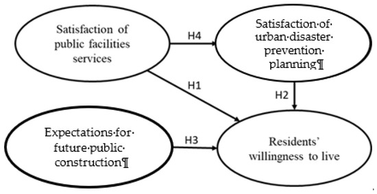 This study posits a series of hypotheses to elucidate the interrelations between urban disaster prevention planning, public service satisfaction, and residents’ intentions to continue residing within an urban setting. These hypotheses are framed to explore the direct and mediating effects within the context of sustainable urban development: