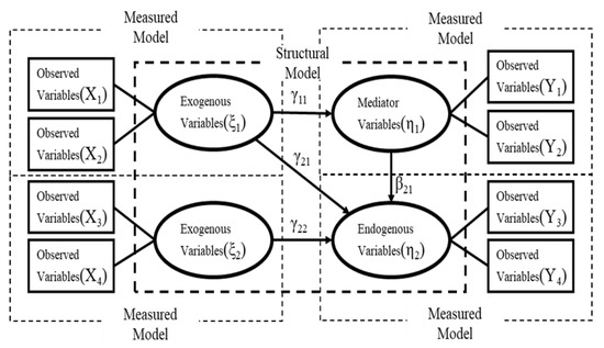 In Figure 3, the linear regression equations for the mediator variable (η1), endogenous variable (η2), and exogenous variables (ξ1, ξ2) can be expressed as follows [27]: