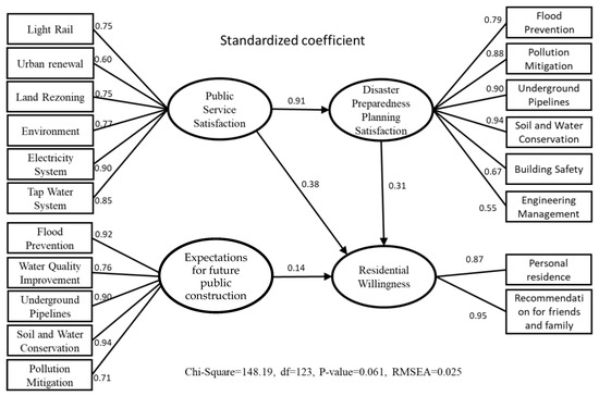 Urban disaster prevention planning satisfaction mediates the relationship between public service satisfaction and residential intentions. This mediation hypothesis suggests that the effect of public service satisfaction on residential intentions is partially transmitted through how residents perceive urban disaster preparedness.