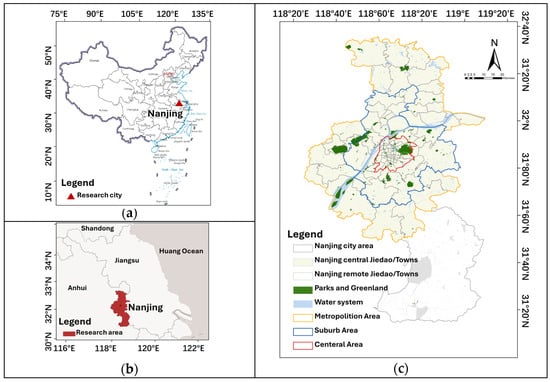 Study area of Nanjing, China. (a) The location of Nanjing in China; (b) the location of Nanjing in Jangsu; (c) the research area.