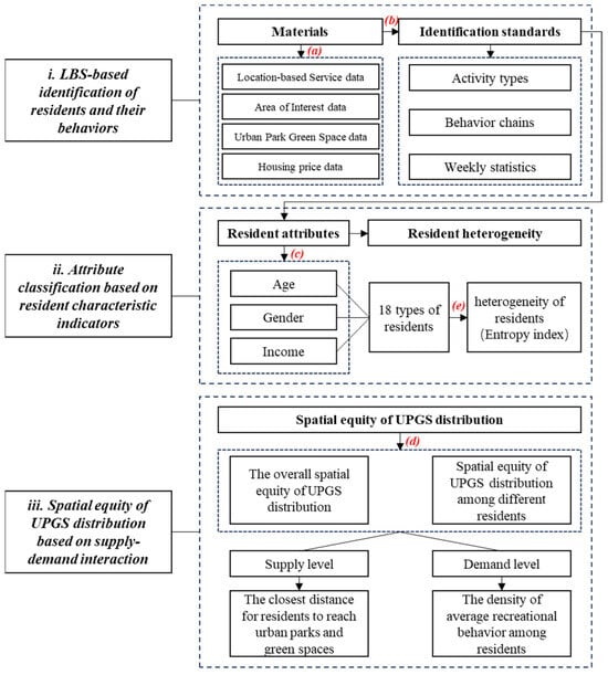 Research framework. (a) Data collection; (b) data preprocessing; (c) connecting multi-source spatiotemporal data through “spatial join *”; (d) calculation of supply, demand, and spatial equity levels; (e) analysis of the relationship between resident heterogeneity and UPGS spatial equity. * Spatial join is a GIS operation that combines the attributes of two spatial datasets based on their spatial relationship, such as intersection or containment.