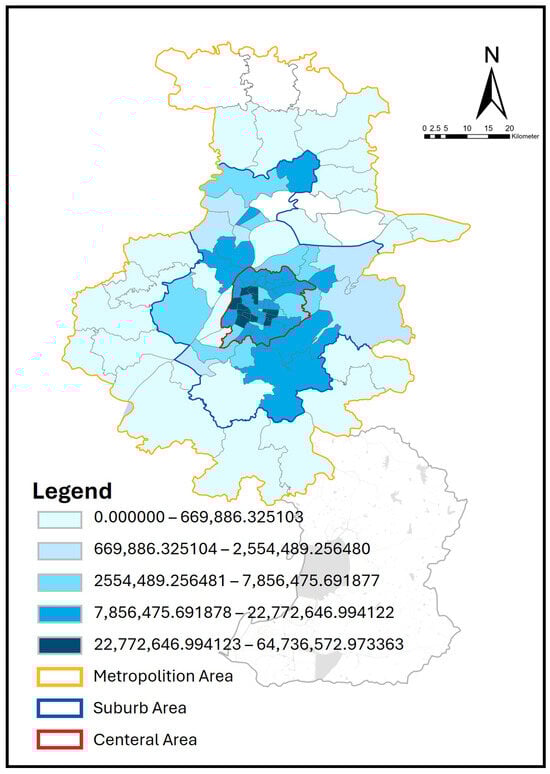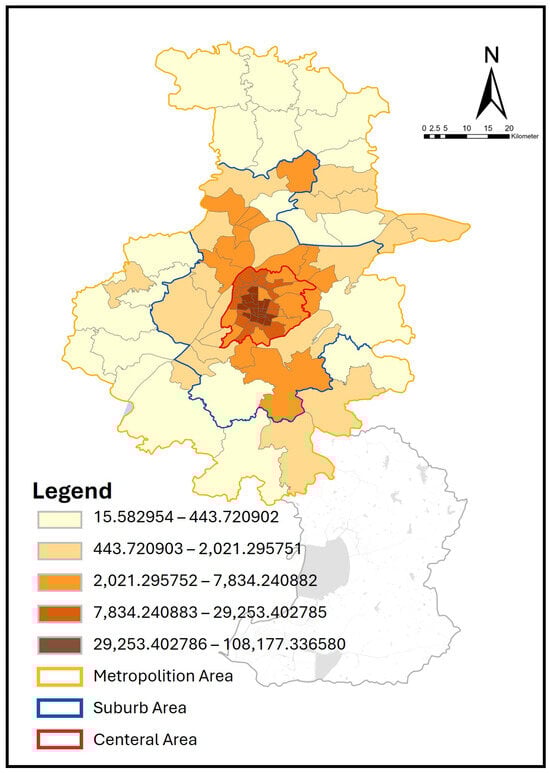 Through the LBS data from 17–24 October 2023, this study identified 104,740 residents with recreational behaviors distributed in ninety-three street units in the main urban area of Nanjing (note: there are a total of one hundred street units in the main urban area of Nanjing, of which seven street units including Guabu Town, Yeshan Town, Zhu Town, Longpao Town, Maji Town, Changlu Street, and Tangquan Farm did not identify residents with recreational behaviors due to the small amount of data, making it difficult to identify regular resident behaviors), accounting for 1.5% of the total population of Nanjing, which is basically consistent with Dianping’s market share in China (i.e., about 18.90 million daily active users in 2023, with a Chinese population of about 1409.67 million [38]). Figure 3 divides the output street units into five categories according to the Jenks Natural Breaks algorithm [39], which creates breaks by grouping similar values (i.e., the number of Nanjing residents here) together in the best way and maximizing the differences between categories. Figure 3 shows that the population density of residents with stable recreational behaviors in the main urban area of Nanjing decreases in rings from the central area (average 2.92 people/km2) to the suburban area (average 0.22 people/km2) to the metropolitan area (average 0.04 people/km2). It is not difficult to see that the residential areas of residents with stable recreational behaviors in the main urban area of Nanjing are spatially concentrated in the central area of Nanjing. Residents in the metropolitan area of Nanjing rarely have stable recreational behaviors. This distribution characteristic is consistent with the trend of population agglomeration towards the central urban area during the urbanization development process of Nanjing [40].