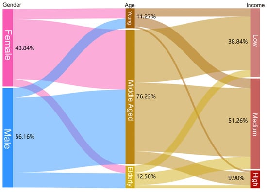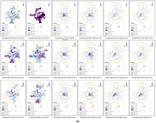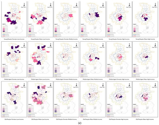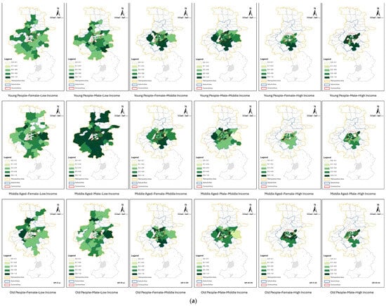 When investigating the overall equity of urban park green space layout in the main urban area of Nanjing, this study divides the identified 104,740 residents with recreational behaviors into 18 types of resident groups from three dimensions: age, gender, and income, according to the resident attribute identification method described in Section 3.2 (Figure 4). It is worth noting that the middle-aged (18–60 years old) male middle-income group accounts for the highest proportion of the total population, reaching 21.72%. The second is the middle-aged female middle-income group, accounting for 17.08%. This indicates that among the residents with stable recreational behaviors in the main urban area of Nanjing, the middle-aged and middle-income groups are the main ones, and males are slightly more than females. This is consistent with the characteristics of the population structure in Chinese cities, where the middle-aged population accounts for a high proportion and the middle-income group is the main force [41].